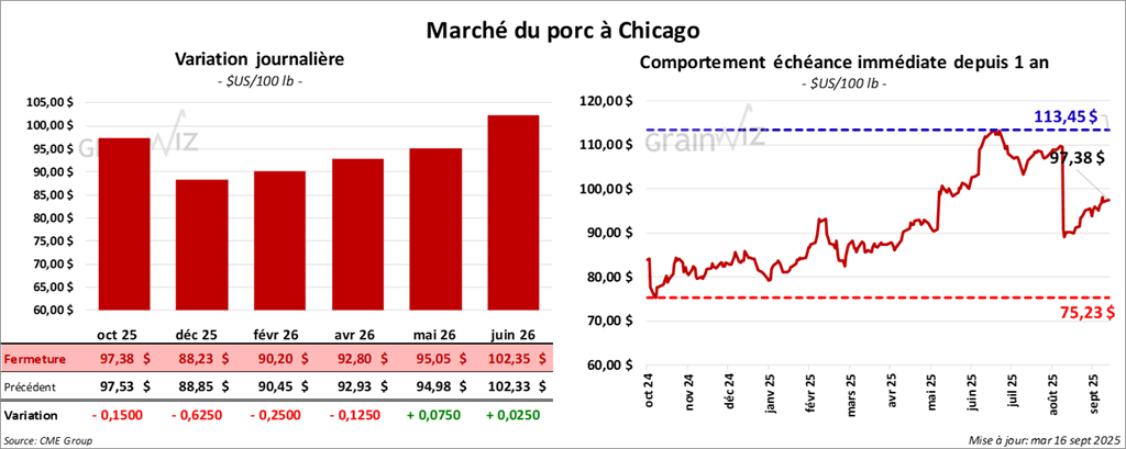 Le contrat de porc américain octobre 25 a clôturé à 97,38 $ (-15 cents). Celui décembre 25 a fermé à 88,23 $ (-63 cents). Celui février 26 a terminé à 90,20 $ (-25 cents).
