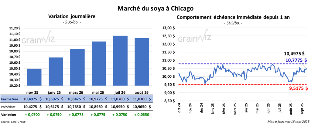 Le contrat de soya américain novembre 25 a clôturé à 10,4975 $ (+ 7 cents). Celui janvier 26 a fermé à 10,6925 $ (+ 7 ½ cents). Celui mars 26 a terminé à 10,8425 $ (+ 7 ¾ cents).