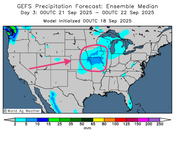 - Les cartes GFS (World Ag Weather) jusqu’au 3e jour indiquent des pluies surtout au centre du Midwest (Iowa, Missouri et environs) et possiblement plus abondantes plus au nord (Minnesota). C'est ce que montre en partie la carte du 3e jour ci-dessous. Globalement, les prévisions américaines sur 3 jours sont correctes.