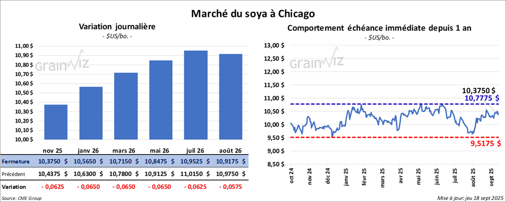 Le contrat de soya américain novembre 25 a clôturé à 10,3750 $ (- 6 ¼ cents). Celui janvier 26 a fermé à 10,5650 $ (- 6 ½ cents). Celui mars 26 a terminé à 10,7150 $ (- 6 ½ cents).