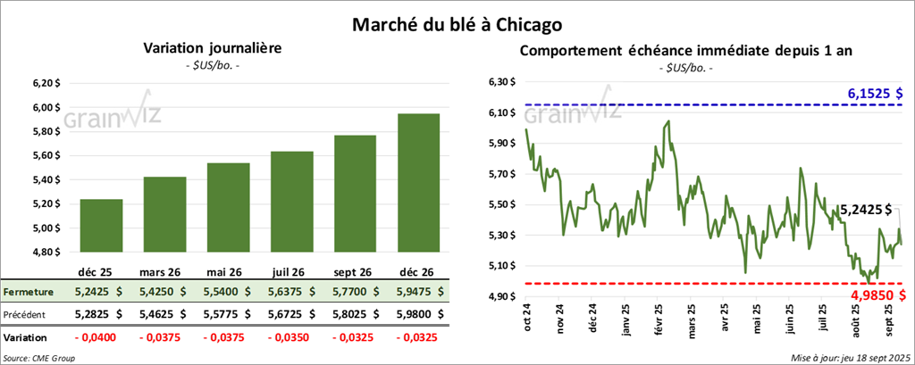 À Chicago, le contrat décembre 25 a clôturé à 5,2425 $ (-4 cents). Celui mars 26 a fermé à 5,4250 $ (- 3 ¾ cents). Celui mai 26 a terminé à 5,5400 $ (- 3 ¾ cents).