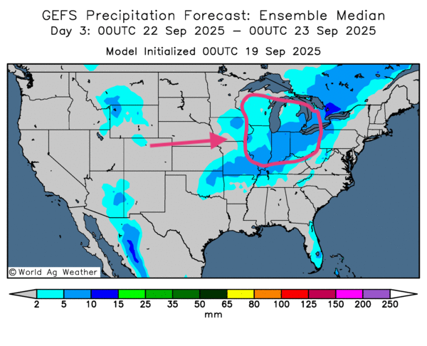 - Globalement, les prévisions demeurent favorables à court terme pour la plupart des zones de production. Les cartes GFS (Word Ag Weather) jusqu’au 3e jour montrent des pluies variables pour l’est et le centre du Midwest; le nord-ouest (nord des Plaines) pourrait rester plus sec.