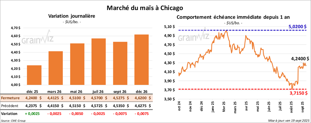 Le contrat de maïs américain décembre 25 a clôturé à 4,2400 $ (+ ¼ cent). Celui mars 26 a fermé à 4,4125 $ (- ¼ cent). Celui mai 25 a terminé à 4,5100 $ (- ½ cent).