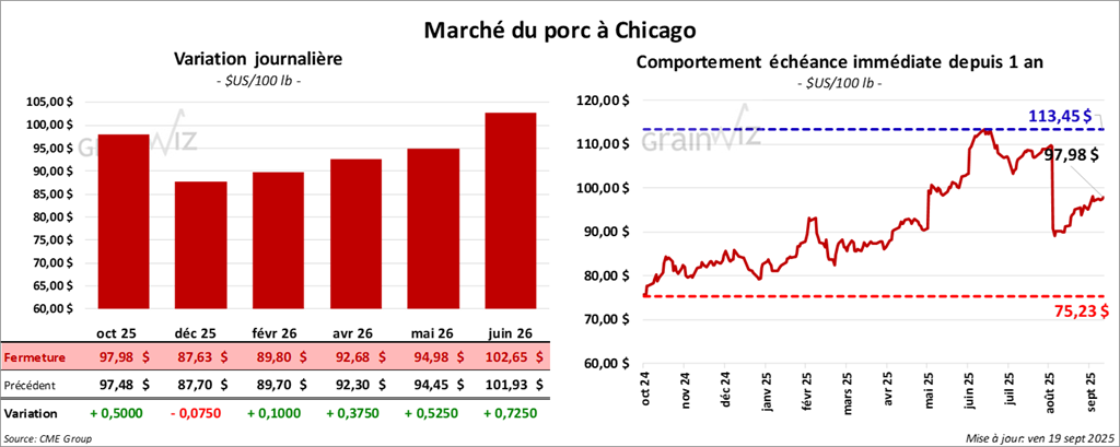 Le contrat de porc américain octobre 25 a clôturé à 97,97 $ (+ 50 cents). Celui décembre 25 a fermé à 87,63 $ (- 0,07 cent). Celui février 26 a terminé à 89,80 $ (+ 10 cents).