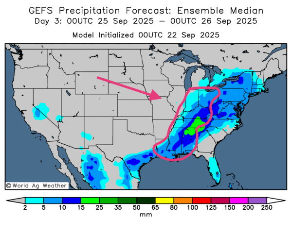- À court terme, la météo US demeure globalement favorable. Les cartes GFS (World Ag Weather) montrent des pluies possibles à grande échelle (Midwest + Plaines). Le système, en glissant vers le sud-est, pourrait toutefois épargner les Dakotas et des zones plus à l’est (Minnesota ; parties du Wisconsin).