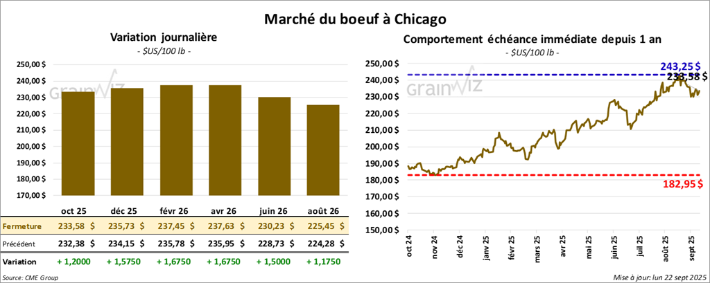 Le contrat de bœuf américain octobre 25 a clôturé à 233,58 $ (+ 1,20 $). Celui décembre 25 a fermé à 235,73 $ (+1,58 $). Celui février 26 a terminé à 237,45 $ (+ 1,68 $).