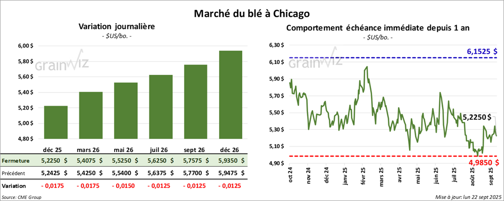 À Chicago, le contrat de blé décembre 25 a clôturé à 5,2250 $ (- 1 ¾ cent). Celui mars 26 a fermé à 5,4075 $ (- 1 ¾ cent). Celui mai 26 a terminé à 5,5250 $ (- 1 ½ cent).