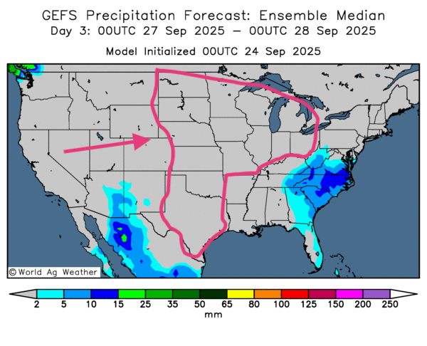 - Lecture GFS (World Ag Weather) jusqu’au 3e jour : signal majoritairement sec et favorable pour le Midwest et la plupart des Plaines; la carte du 3e jour ci-dessous l’illustre.