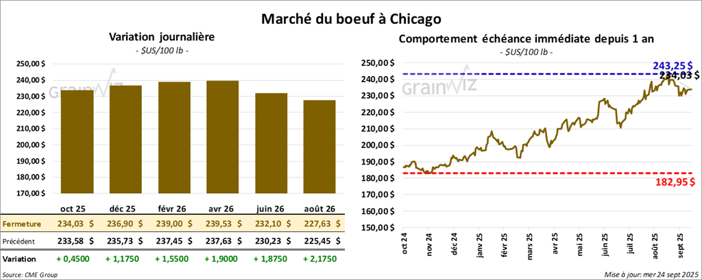 Le contrat de bœuf américain octobre 25 a clôturé à 234,03 $ (+ 45 cents). Celui décembre 25 a fermé à 236,90 $ (+ 1,18 $). Celui février 26 a terminé à 239,00 $ (+ 1,55 $).