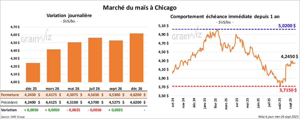 Le contrat de maïs américain décembre 25 clôturé à 4,2450 $ (+ ½ cent). Celui mars 26 a fermé à 4,4175 $ (+ ½ cent). Celui mai 26 a terminé à 4,5075 $ (- ¼ cent).