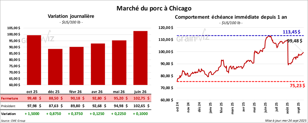Le contrat de porc américain octobre 25 a clôturé à 99,47 $ (+ 1,50 $). Celui décembre 25 a fermé à 88,50 $ (+ 88 cents). Celui février 26 a terminé à 90,17 $ (+ 38 cents).