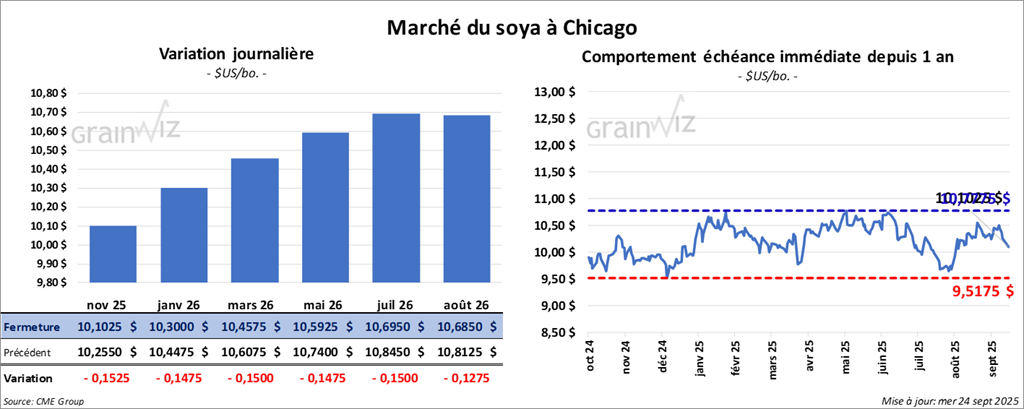 Le contrat de soya américain novembre 25 a clôturé à 10,1025 $ (- 15 ¼ cents). Celui janvier 26 a fermé à 10,3000 $ (- 14 ¾ cents). Celui mars 26 a terminé à 2,4575 $ (- 15 cents).
