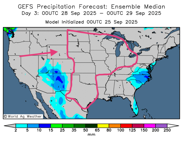 - À court terme, la météo américaine reste globalement favorable. Les cartes GFS (World Ag Weather, dessins jusqu’au 3e jour) n’indiquent pas de chargement notable ; Midwest et Plaines devraient demeurer secs, propices aux activités de récolte. C'est ce qu'illustre la carte du 3e jour présentée ci-dessous.