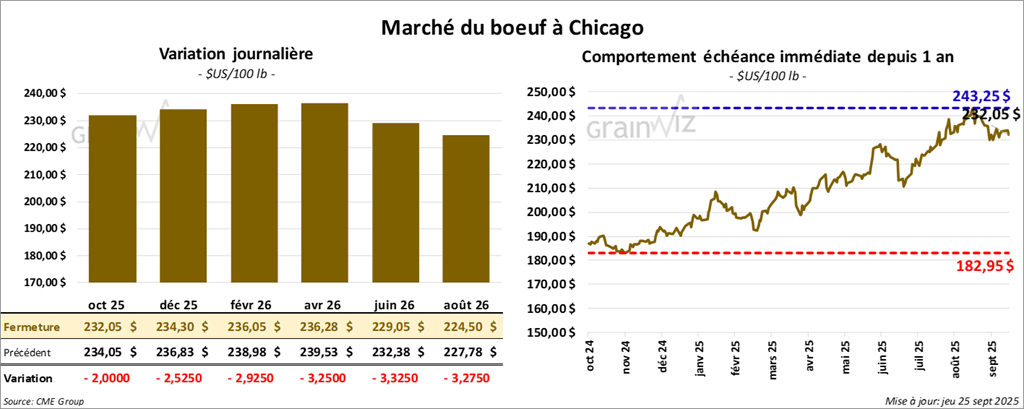 Le contrat de bœuf américain octobre 25 a clôturé à 232,05 $ (-2,00$). Celui décembre 25 a fermé à 234,30 $ (-2,53 $). Celui février 26 a terminé à 236,05 $ (-2,93 $).