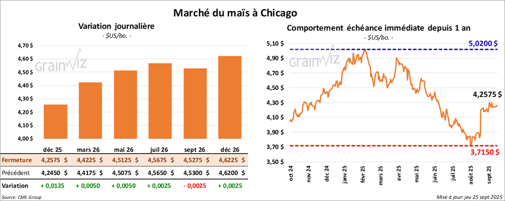 Le contrat de maïs américain décembre 25 a clôturé à 4,2575 $ (+ 1 ¼ cent). Celui mars 26 a fermé à 4,4225 $ (+ ½ cent). Celui mai 26 a terminé à 4,5125 $ (+ ½ cent).