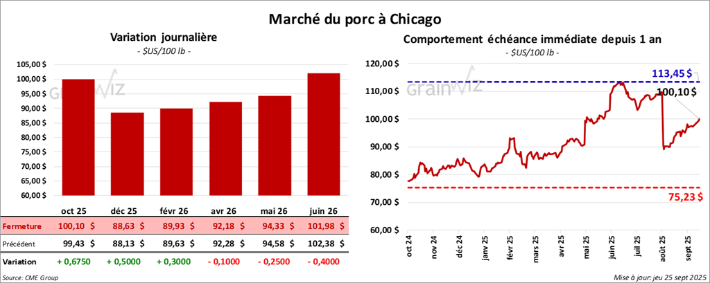 Le contrat de porc américain octobre 25 a clôturé à 100,10 $ (+ 68 cents). Celui décembre 25 a fermé à 88,63 $ (+ 50 cents). Celui février 26 a terminé à 89,93 $ (+ 30 cents).