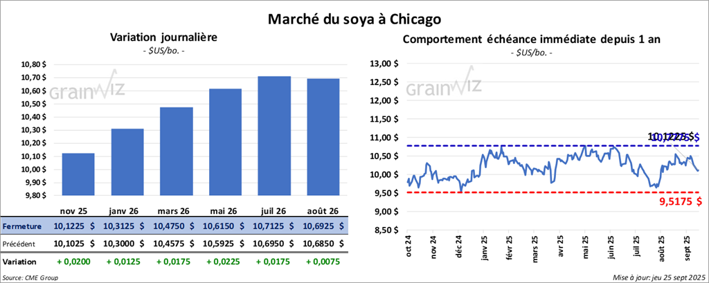 Le contrat de soya américain novembre 25 a clôturé à 10,1225 $ (+ 2 cents). Celui janvier 26 a fermé à 10,3125 $ (+ 1 ¼ cent). Celui mars 26 a terminé à 10,4750 $ (+ 1 ¾ cent).