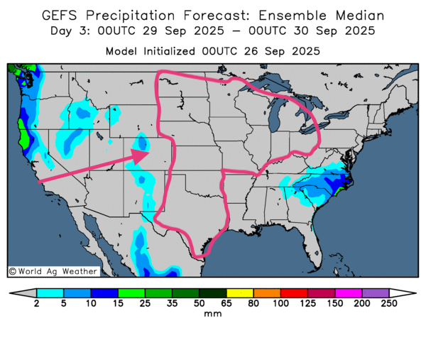 - Globalement, les prévisions US restent positives à court terme : les cartes GFS (Word Ag Weather) illustrées jusqu’au 3e jour ne montrent pas de changement — temps probablement sec à l’échelle du Midwest et des Plaines ; cadence des travaux maintenue.