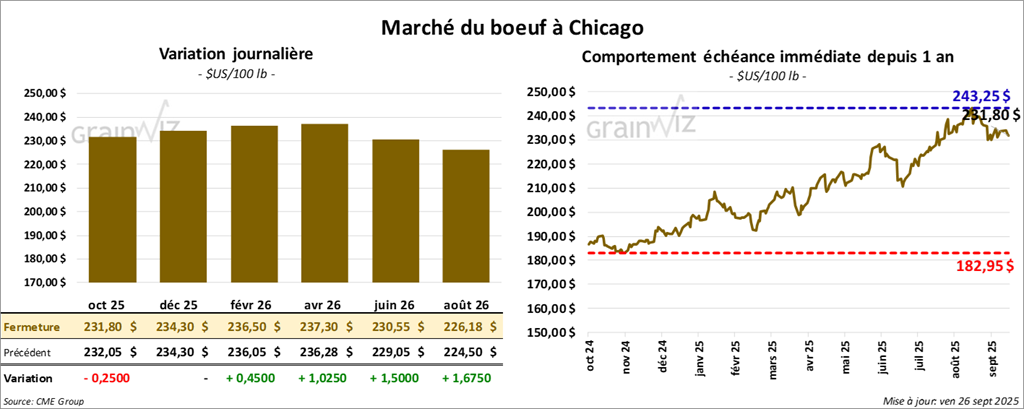 Le contrat de bœuf américain octobre 25 a clôturé à 231,80 $ (- 25 cents). Celui décembre 25 a fermé à 234,30 $ (0,00). Celui février 26 a terminé à 236,50 $ (+ 45 cents).