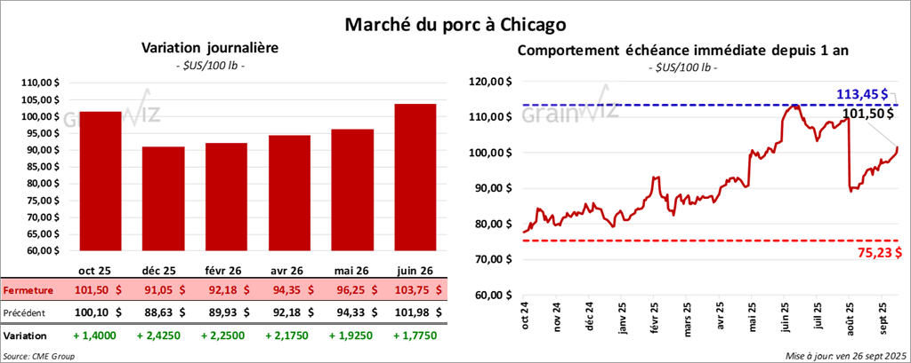 Le contrat de porc américain octobre 25 a clôturé à 101,50 $ (+ 1,40 $). Celui décembre 25 a fermé à 91,05 $ (+ 2,42 $). Celui février 26 a terminé à 92,17 $ (+ 2,25 $).