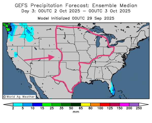 - En bref, la météo US demeure favorable (à court terme) aux récoltes. Les cartes GFS de World Ag Weather, tracées jusqu’au 3e jour, laissent envisager du temps sec sur quasi tout le Midwest et les Grandes Plaines — voir la carte du 3e jour.