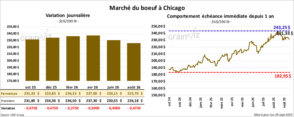 Le contrat de bœuf américain octobre 25 a clôturé à 231,32 $ (-47 cents). Celui décembre 25 a fermé à 233,82 $ (-47 cents). Celui février 26 a terminé à 236,22 $ (-28 cents).