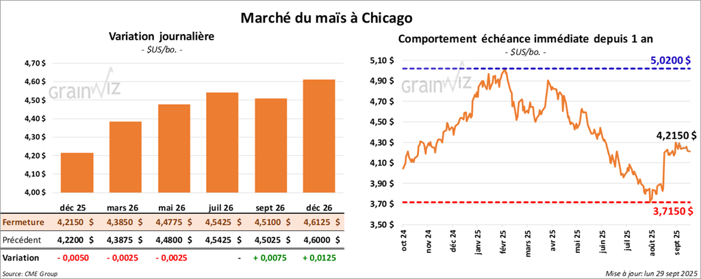Le contrat de maïs américain décembre 25 clôturé à 4,2150 $ (- ½ cent). Celui mars 26 a fermé à 4,3850 $ (- ¼ cent). Celui mai 26 a terminé à 4,4775 $ (- ¼ cent).