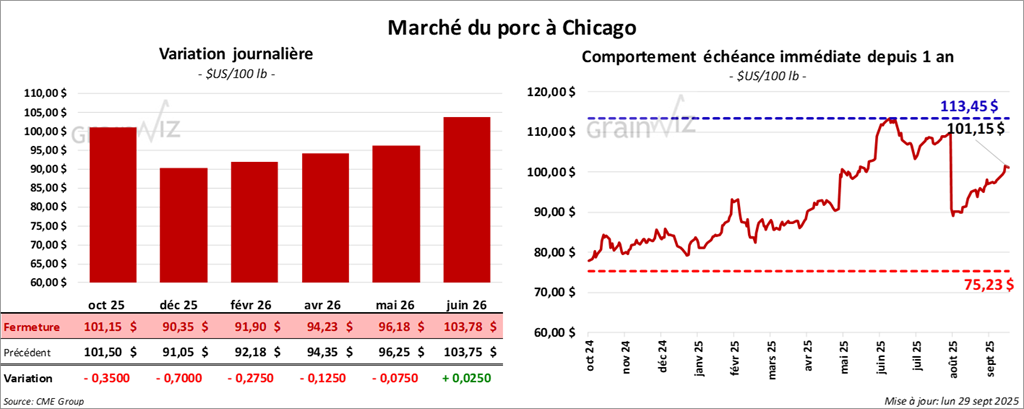 Le contrat de porc américain octobre 25 a clôturé à 101,15 $ (-35 cents). Celui décembre 25 a fermé à 90,35 $ (-70 cents). Celui février 26 a terminé à 91,90 $ (-28 cents).