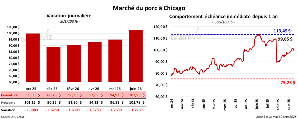 Le contrat de porc américain octobre 25 a clôturé à 99,85 $ (-1,30 $). Celui décembre 25 a fermé à 88,72 $ (-1,63 $). Celui février 26 a terminé à 90,30 $ (-1,60 $).