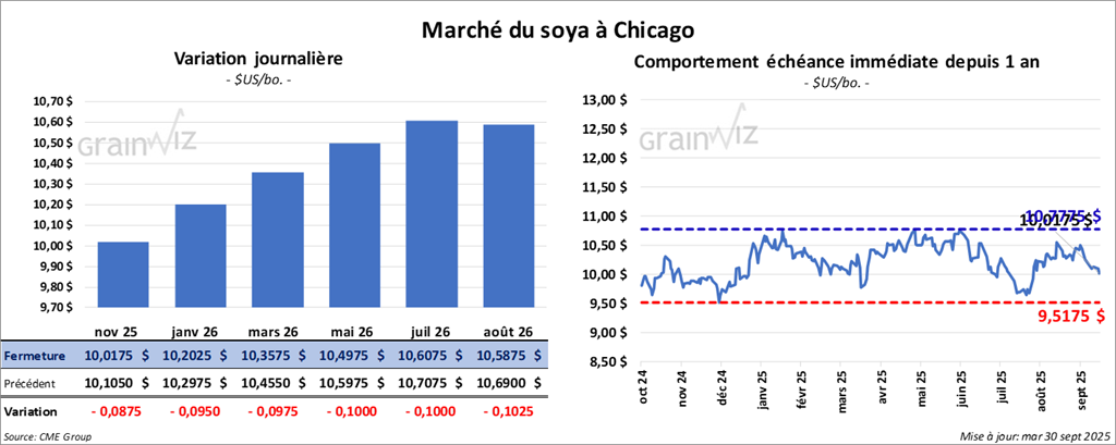 Le contrat de soya américain novembre 25 a clôturé à 10,0175 $ (-8 ¾ cents). Celui janvier 26 a fermé à 10,2025 $ (- 9 ½ cents). Celui mars 26 a terminé à 10,3575 $ (-9 ¾ cents).