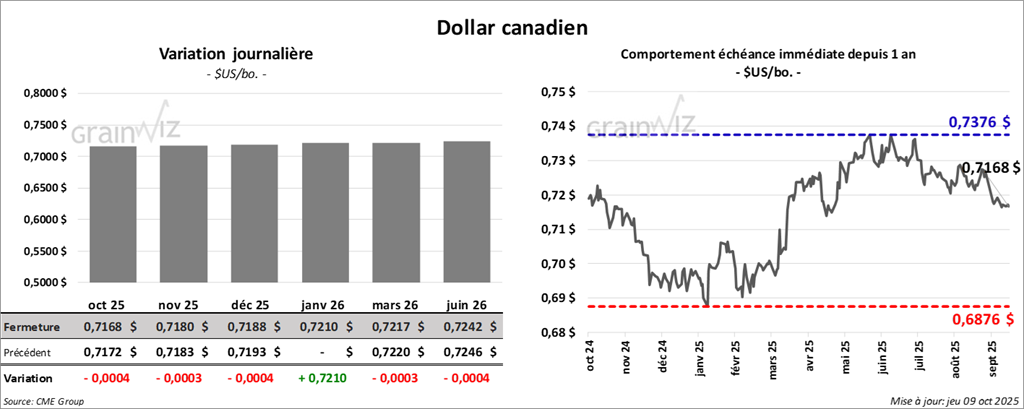 À Chicago, le contrat de blé décembre 25 a clôturé à 5,0725 $ (+ ½ cent). Celui mars 26 a fermé à 5,2525 $ (+ ½ cent). Celui mai 26 a terminé à 5,3775 $ (+ ½ cent).