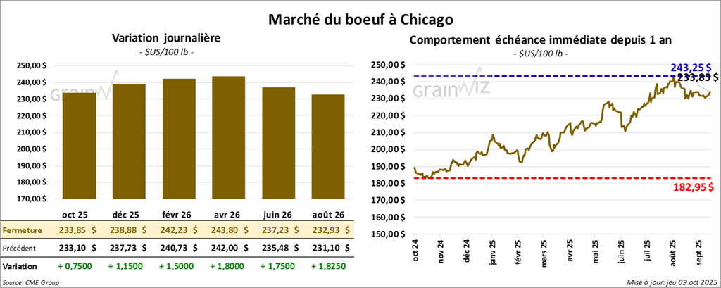 Le contrat de bœuf américain octobre 25 a clôturé à 233,85 $ (+ 75 cents). Celui décembre 25 a fermé à 238,88 $ (+ 1,15 $). Celui février 26 a terminé à 242,23 $ (+ 1,50 $).