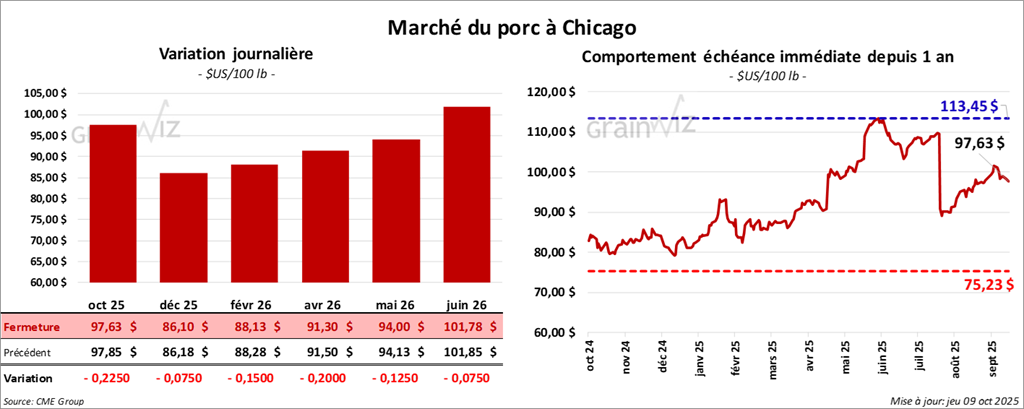 Le contrat de porc américain octobre 25 a clôturé à 97,63 $ (-23 cents). Celui décembre 25 a fermé à 86,10 $ (-0,08 cent). Celui février 26 a terminé à 88,13 $ (-15 cents).