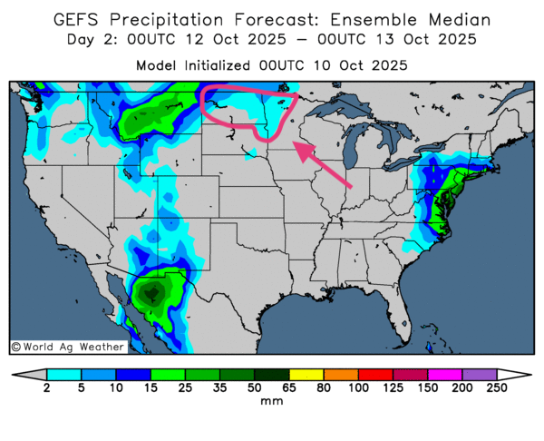 - Bilan court terme : météo globalement favorable aux récoltes. GFS (World Ag Weather) : conditions sèches persistantes jusqu’au 3e jour pour la plupart des régions du Midwest et des Grandes Plaines ; averses possibles au nord-ouest du Midwest (ND, MN ; voir carte jour 2).