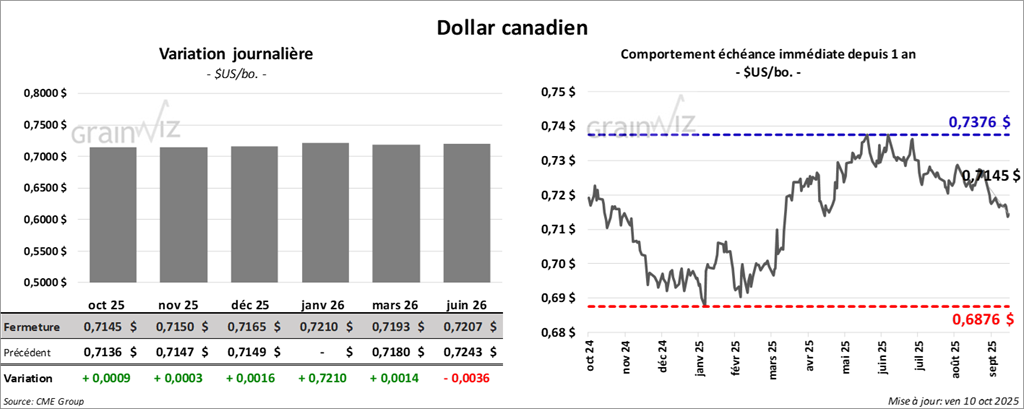 Du côté de l'huile de soya américaine, le contrat octobre 25 a terminé à 49,40 $ (-98 points). Celui décembre 25 a fini à 49,97 $ (-97 points).