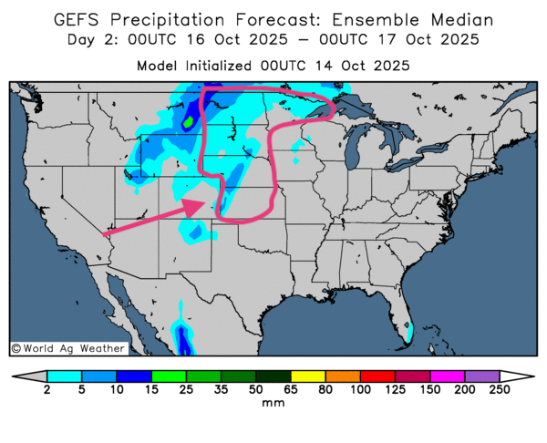 - Globalement, les prévisions météo pour les États-Unis restent correctes à court terme. L'analyse des cartes américaines GFS, fournies par World Ag Weather et dessinées jusqu'au 3e jour, révèle des possibilités de pluie pour le nord-ouest du Midwest et le centre des plaines américaines. Ailleurs, le temps sec pourrait persister à de nombreux endroits (voir notamment la carte pour le 2e jour ci-contre).