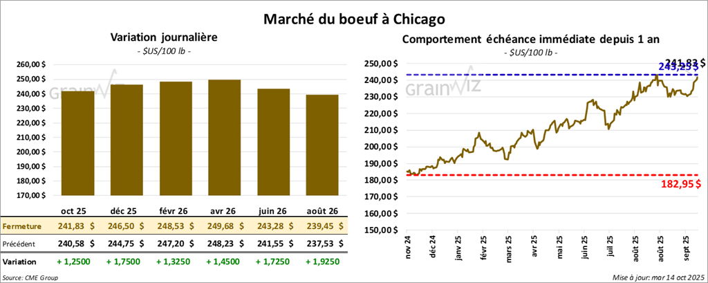 Le contrat de bœuf américain octobre 25 a clôturé à 241,82 $ (+ 1,25 $). Celui décembre 25 a fermé à 246,50 $ (+ 1,75 $). Celui février 26 a terminé à 248,53 $ (+1,32 $).