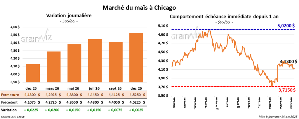Le contrat de maïs américain décembre 25 a clôturé à 4,1300 $ (+ 2 ¼ cents). Celui mars 26 a fermé à 4,2925 $ (+ 2 cents). Celui mai 26 a terminé à 4,3800 $ (+ 2 cents).