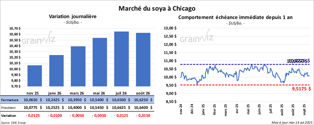 Le contrat de soya américain novembre 25 a clôturé à 10,0650 $ (- 1 ¼ cent). Celui janvier 26 a fermé à 10,2425 $ (- 1 cent). Celui mars 26 a terminé à 10,3950 $ (- ½ cent).