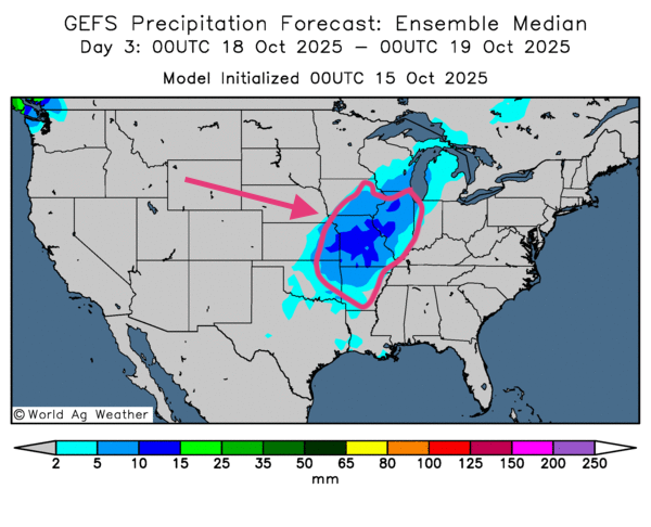 - Globalement, les prévisions météo pour les États-Unis sont correctes à court terme. L'analyse des cartes américaines GFS, fournies par World Ag Weather et dessinées jusqu'au 3e jour, révèle des possibilités d’alternance de pluie et d’ensoleillement pour plusieurs parties du Midwest et des Plaines. Seuls l'extrême sud des Plaines et l'extrême est du Midwest pourraient connaître des conditions sèches persistantes.
