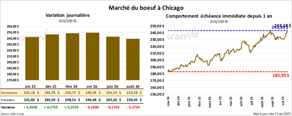 Le contrat de bœuf américain octobre 25 a clôturé à 242,18 $ (+ 35 cents). Celui décembre 25 a fermé à 246,78 $ (+ 28 cents). Celui février 26 a terminé à 248,75 $ (+ 23 cents).