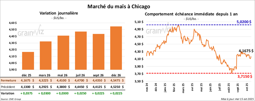 Le contrat de maïs américain décembre 25 a clôturé à 4,1675 $ (+ 3 ¾ cents). Celui mars 26 a fermé à 4,3225 $ (+ 3 cents). Celui mai 26 a terminé à 4,4100 $ (+ 3 cents).