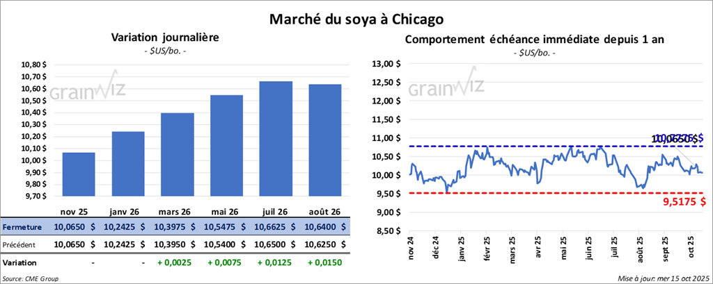 Le contrat de soya américain novembre 25 a clôturé à 10,0650 $ (0,0). Celui janvier 26 a fermé à 10,2425 $ (0,0). Celui mars 26 a terminé à 10,3975 $ (+ ¼ cent).