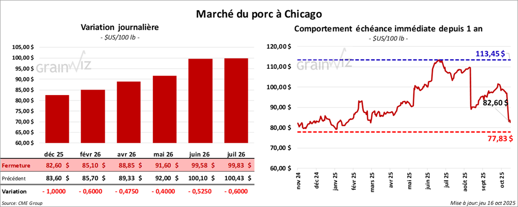 Le contrat de porc américain décembre 25 a clôturé à 82,60 $ (-1,00 $). Celui février 26 a fermé à 85,10 $ (- 60 cents). Celui avril 36 a terminé à 88,85 $ (-48 cents).