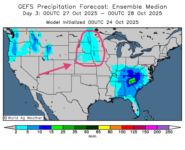 - À court terme, les perspectives restent correctes. D’après les cartes GFS américaines (World Ag Weather), dessinées jusqu’au 3e jour, le sud des Plaines et les zones au sud du Midwest présentent le plus fort potentiel de pluie ; des précipitations légères demeurent possibles dans les secteurs asséchés à l’ouest des Grands Lacs.