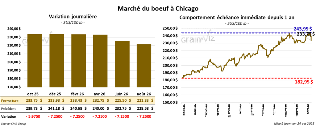 Le contrat de bœuf américain octobre 25 a clôturé à 233,75 $ (-5,97 $). Celui décembre 25 a fermé à 233,93 $ (-7,25 $). Celui février 26 a terminé à 233,43 $ (-7,25 $).