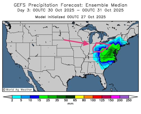 - À court terme, les prévisions américaines restent correctes. Les cartes GFS (World Ag Weather), tracées jusqu’au 3e jour, indiquent des fenêtres de pluie et d’ensoleillement pour certaines parties de l’est des Plaines, avec un système susceptible d’atteindre le reste du Midwest. Ces averses seraient utiles à l’implantation du blé d’hiver dans plusieurs régions, mais les précipitations attendues pourraient ralentir les travaux aux champs.