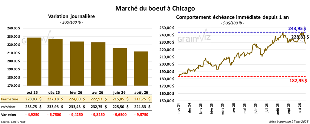 Le contrat de bœuf américain octobre 25 a clôturé à 228,82 $ (-4,92 $). Celui décembre 25 a fermé à 227,18 $ (- 6,75 $). Celui février 26 a terminé à 224,00 $ (-9,43 $).