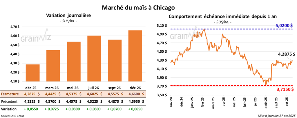 Le contrat de maïs décembre 25 a clôturé à 4,2875 $ (+ 5 ½ cents). Celui mars 26 a fermé à 4,4425 $ (+ 7 ¼ cents). Celui mai 26 a terminé à 4,5375 $ (+ 8 cents).