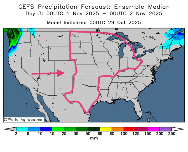 - Au cours des prochains jours, World Weather prévoit des précipitations dans le sud des Grands Lacs, à la hauteur du Kentucky et de l'Ohio, et plus à l'ouest, au Missouri. Par ailleurs, l’organisme anticipe aussi des conditions sèches pour la plupart des régions des Plaines américaines associées à la culture du blé d'hiver. Dans ces secteurs, les activités aux champs pourraient s'accélérer.